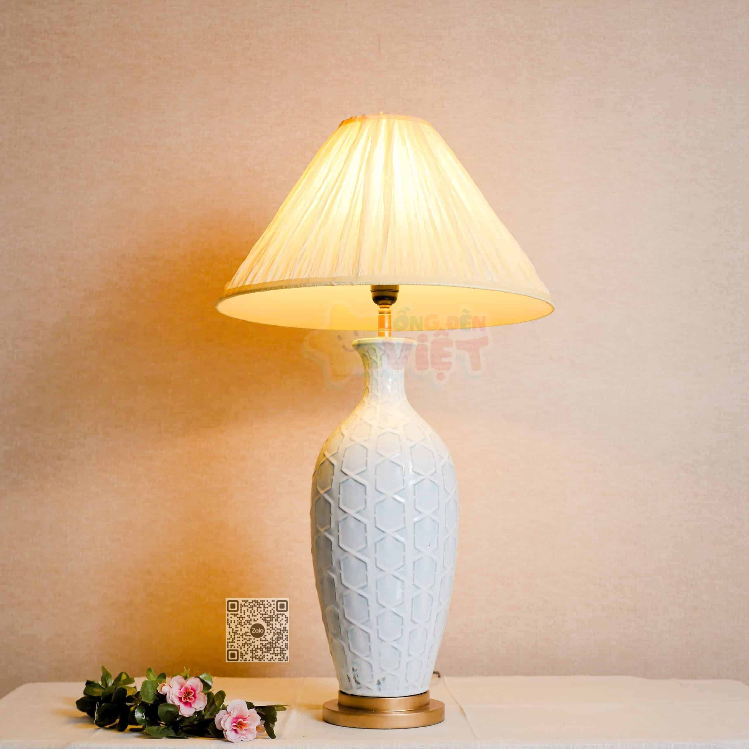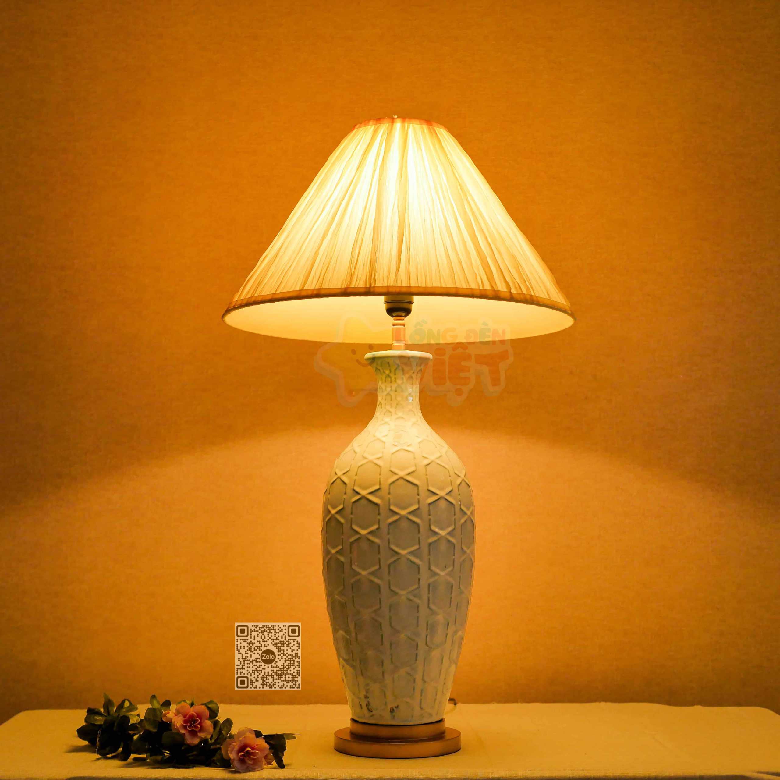 – Chất liệu: bình sứ, khung chao đèn bằng sắt, mica bọc vải nhăn