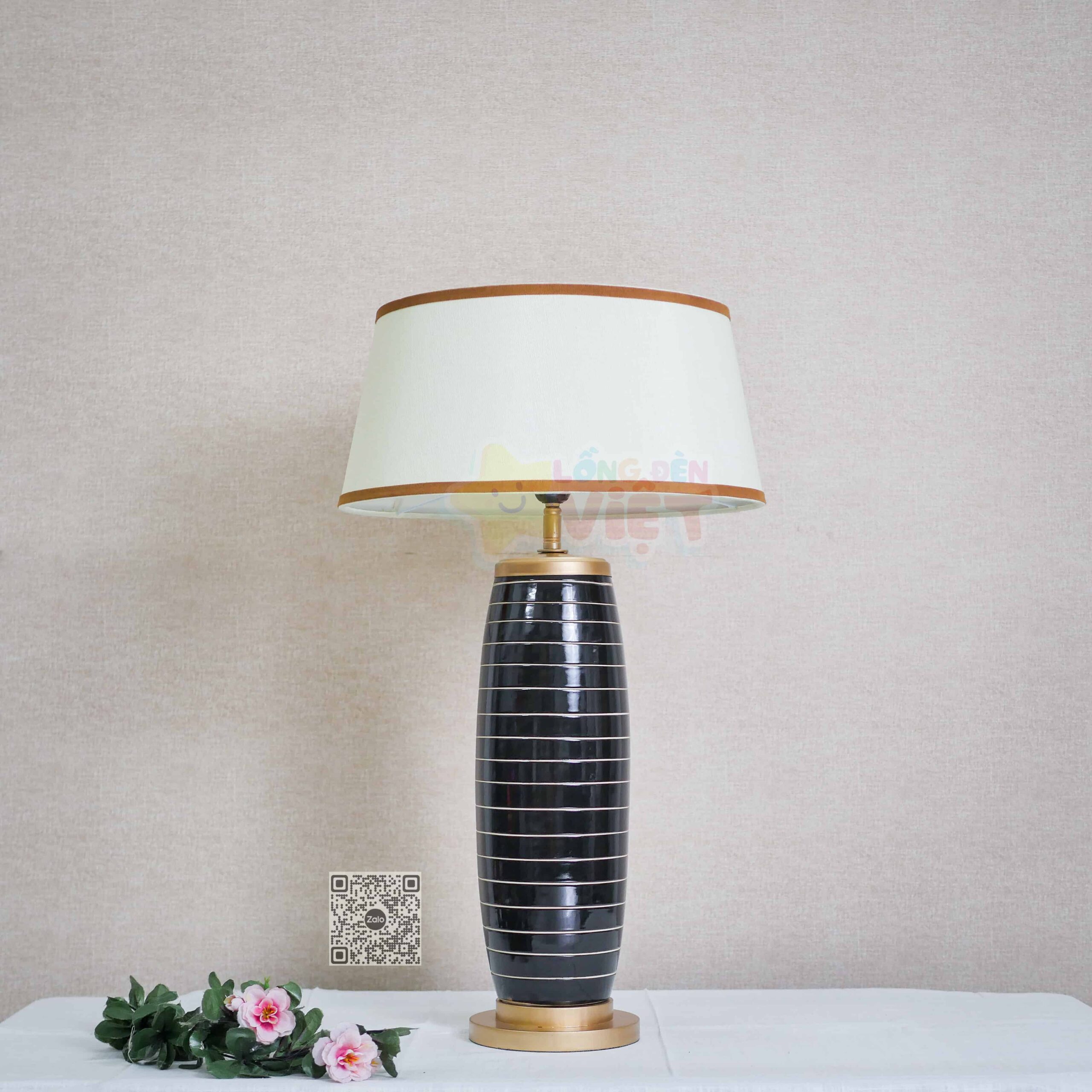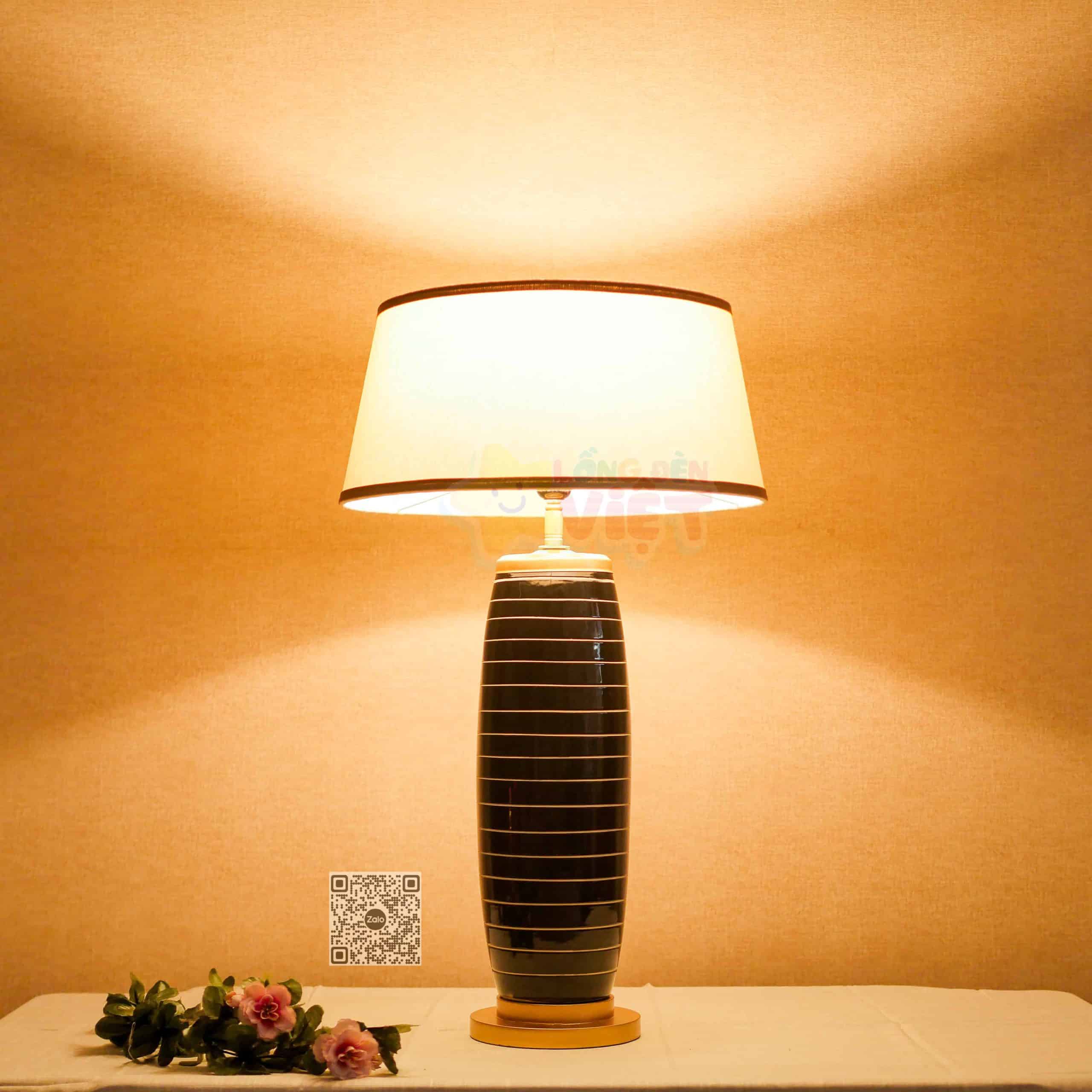 – Chất liệu: bình sứ, ti sắt, đế gỗ và chao đèn vải đũi